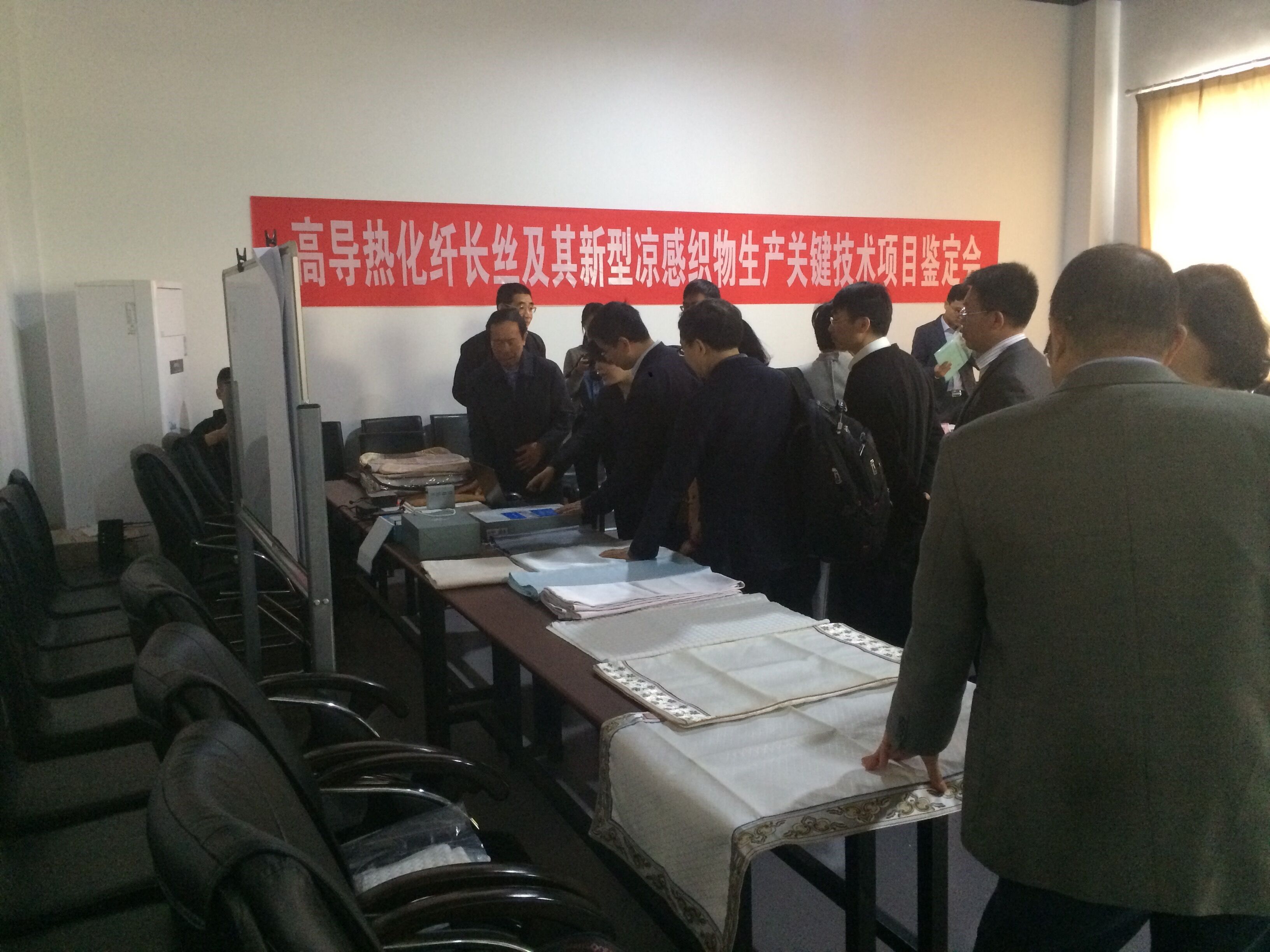 2017年4月27日,中國紡織工業(yè)聯(lián)合會組織召開了高導(dǎo)熱化纖長絲及其新型涼感織物生產(chǎn)關(guān)鍵技術(shù)項目鑒定會(見圖1、圖2)。其中,由我公司和總后軍需研究所合作研制的用于測試涼感織物涼爽性能的快速響應(yīng)式FFZ415熱流式織物涼感測試儀,受到了鑒定委員會的認可,項目順利通過鑒定。